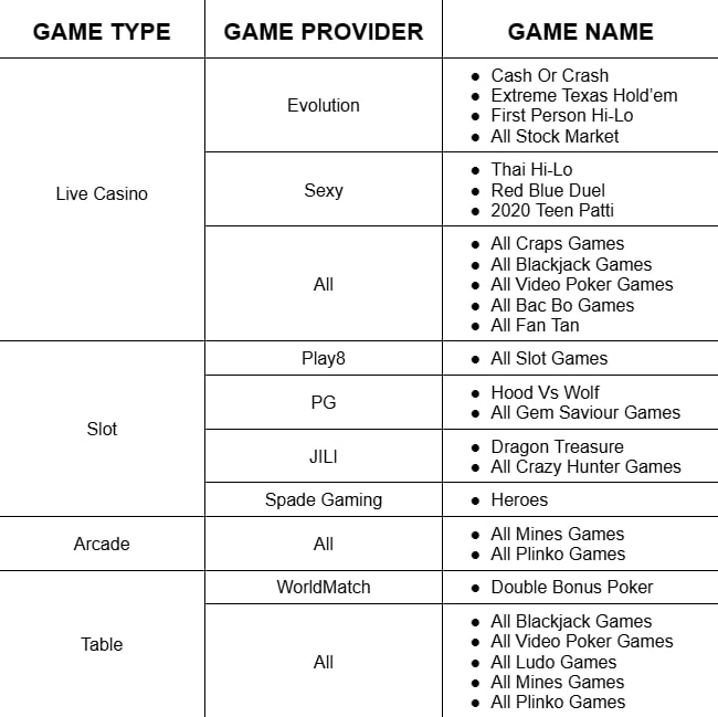 While most bets placed on our platform can be counted towards turnover calculation, and the bonuses we offer can be used on a wide range of games, there are some exceptions. For detailed information about the games and sport markets excluded from bonus wagering and turnover calculations, please refer to the table below: