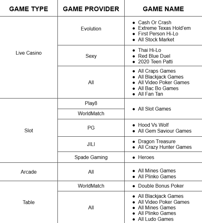 While most bets placed on our platform can be counted towards turnover calculation, and the bonuses we offer can be used on a wide range of games, there are some exceptions. For detailed information about the games and sport markets excluded from bonus wagering and turnover calculations, please refer to the table below: