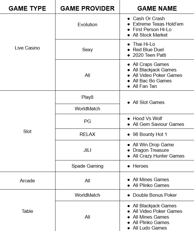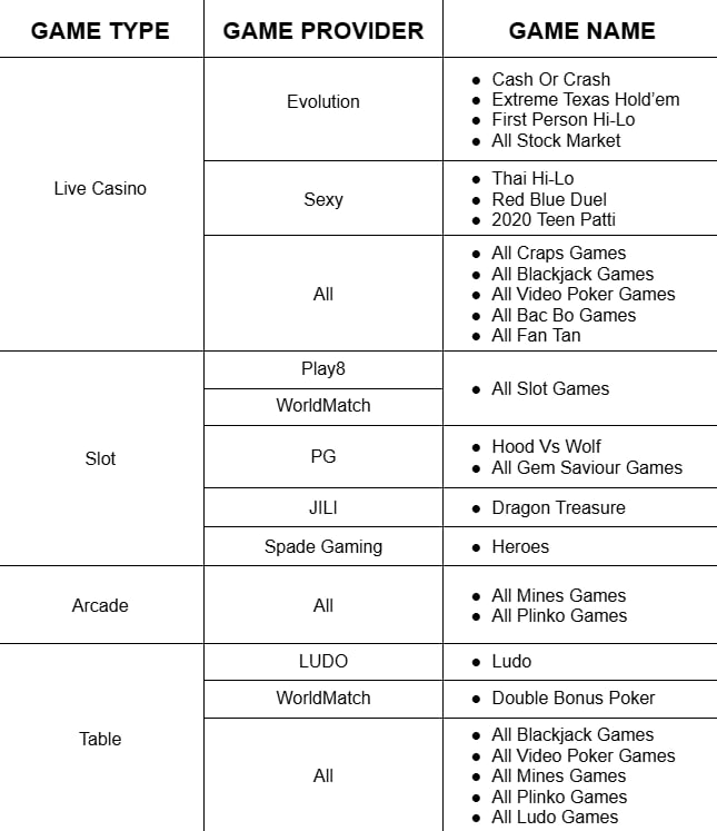 While most bets placed on our platform can be counted towards turnover calculation, and the bonuses we offer can be used on a wide range of games, there are some exceptions. For detailed information about the games and sport markets excluded from bonus wagering and turnover calculations, please refer to the table below: