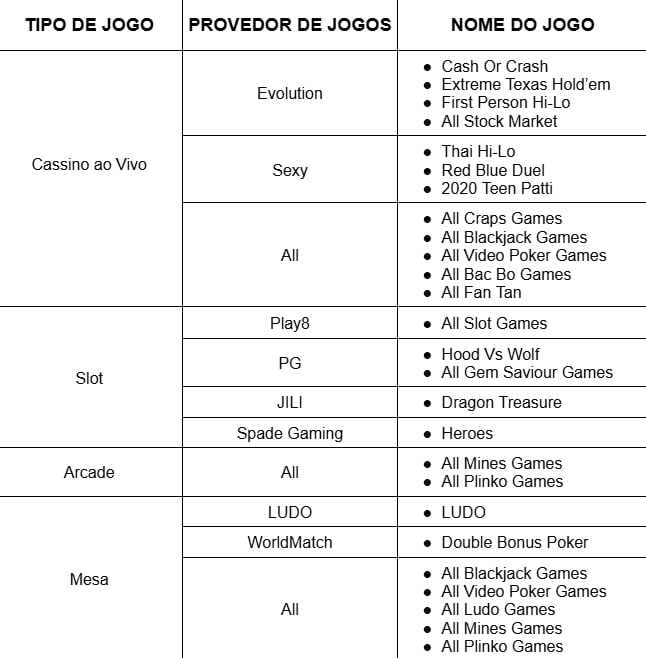 Embora a maioria das apostas feitas em nossa plataforma possam ser contadas para o cálculo do turnover, e os bônus que oferecemos possam ser usados em uma ampla variedade de jogos, há algumas exceções. Para obter informações detalhadas sobre os jogos e mercados esportivos excluídos dos cálculos de apostas de bônus e turnover, consulte a tabela abaixo: