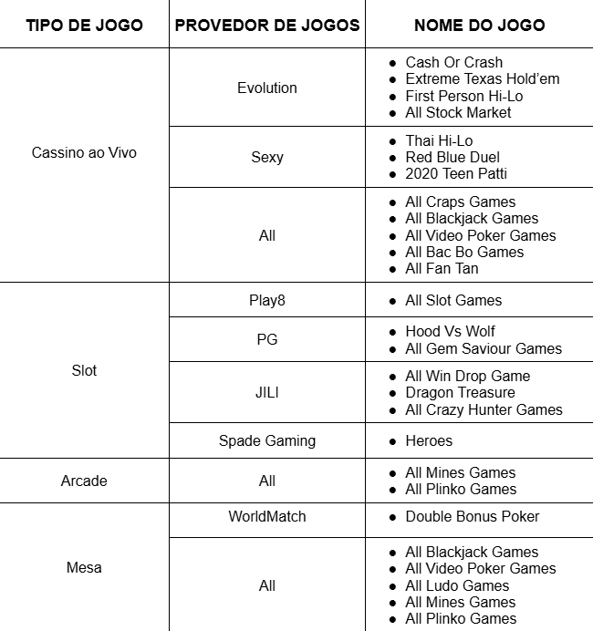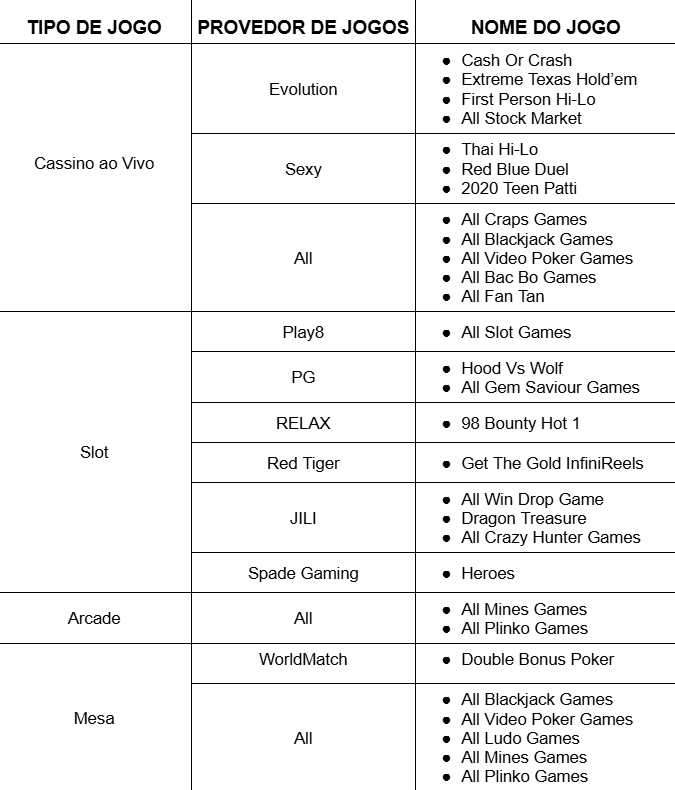 Embora a maioria das apostas em nossa plataforma conte para o ganho de Pontos VIP, temos algumas exceções a essa regra. Para maiores detalhes sobre os jogos excluídos do ganho de Pontos VIP, consulte a tabela abaixo: