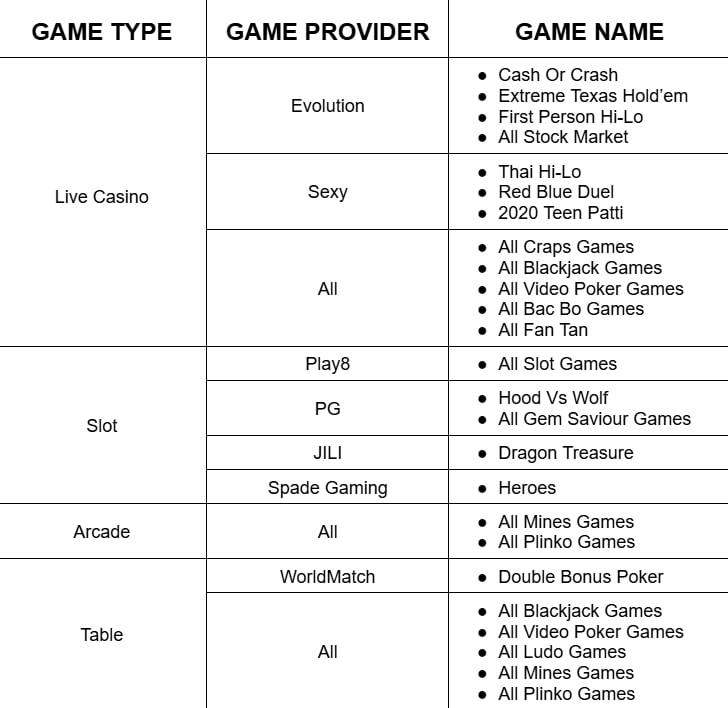 While most bets placed on our platform can be counted towards turnover calculation, and the bonuses we offer can be used on a wide range of games, there are some exceptions. For detailed information about the games and sport markets excluded from bonus wagering and turnover calculations, please refer to the table below: