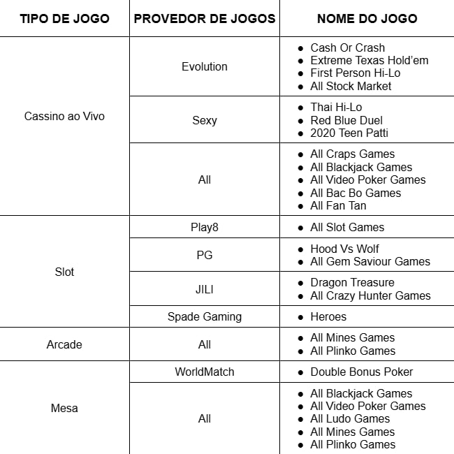 Embora a maioria das apostas feitas em nossa plataforma possam ser contadas para o cálculo do turnover, e os bônus que oferecemos possam ser usados em uma ampla variedade de jogos, há algumas exceções. Para obter informações detalhadas sobre os jogos e mercados esportivos excluídos dos cálculos de apostas de bônus e turnover, consulte a tabela abaixo: